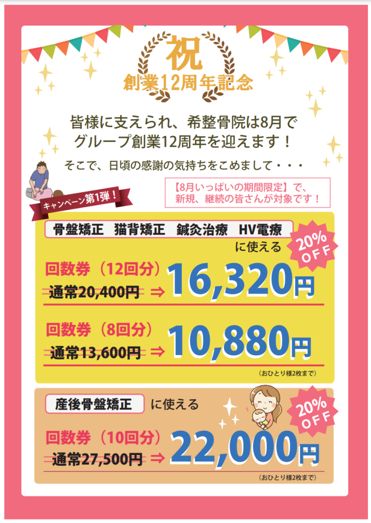 12周年記念キャンペーン【8月】 | 福岡県春日市の整骨院「希整骨院」